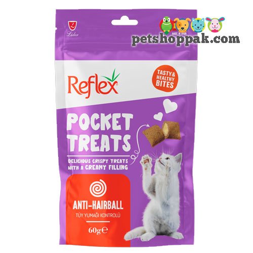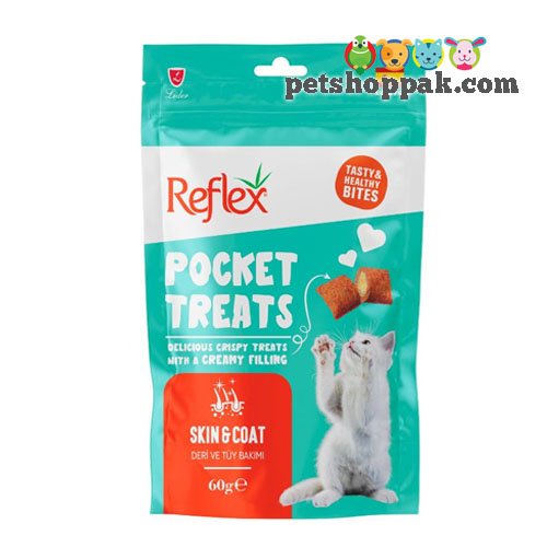 Reflex Pocket Treats offer tailored nutrition for adult cats, addressing various needs with delicious and nutritious options. The Sensitive variant supports digestive health with prebiotics and yucca, while taurine promotes heart, vision, and immune function. For picky eaters, Choosy treats enhance skin, coat, and bone health with a vitamin-rich formula. The Anti Hairball option, enriched with fiber and malt, prevents hairball formation and ensures comfort. For optimal skin and coat health, Skin Coat treats feature krill, biotin, and omega-3 fatty acids. Finally, Dental Care treats help reduce tartar buildup with sodium tripolyphosphate, promoting dental health alongside taurine’s immune and heart benefits. With 29% protein and 20% fat, Reflex Pocket Treats are a flavorful and wholesome choice for your feline friend.